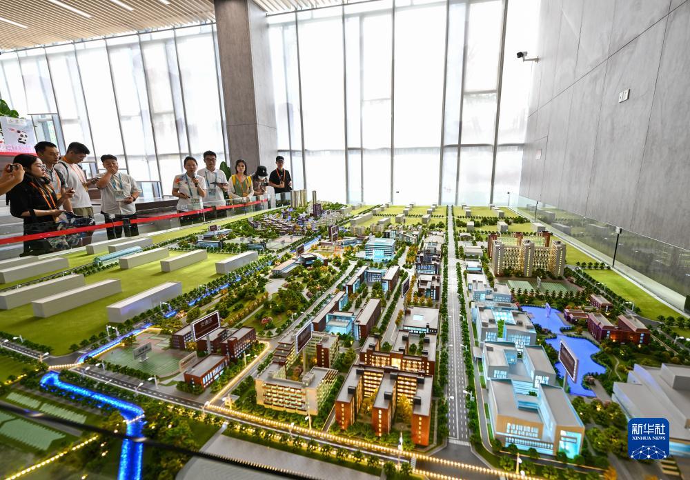 7月15日,媒体记者在大运村欢迎中心观看园区沙盘。