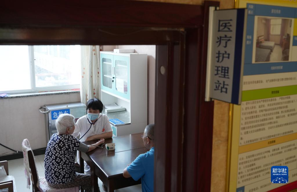 7月17日,在正定县塔元庄村劲松老年公寓,工作人员在医疗护理站给老人检查身体。