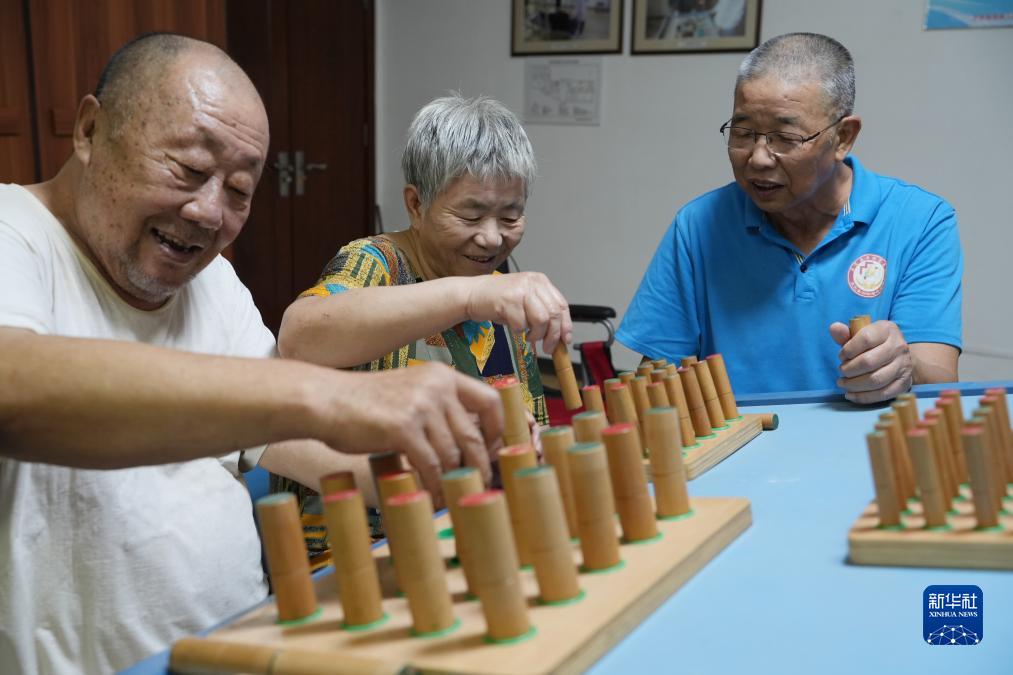 7月17日,在正定县塔元庄村劲松老年公寓,老人在活动室进行益智训练。