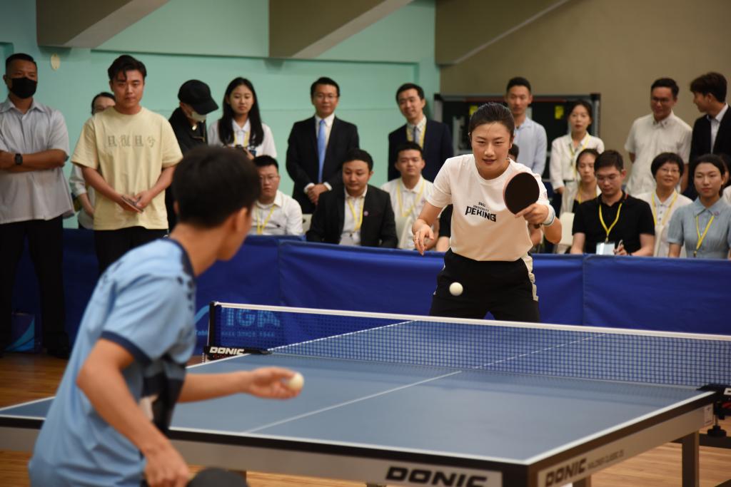 在政大体育馆,大陆学生团团长、奥运冠军丁宁与政大乒乓球校队选手切磋球技,耐心指导接发球、拨球技巧,引来台湾球迷到场助威。