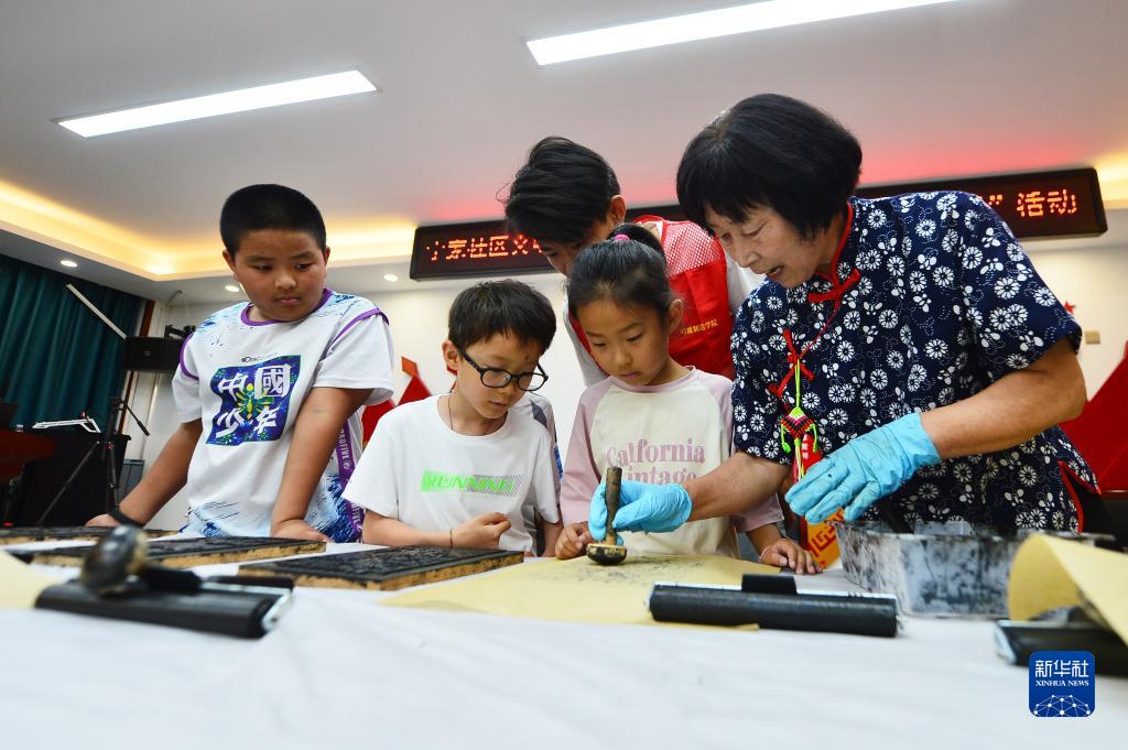 7月17日,在山东省青岛市城阳区红岛街道宁家社区公益课堂,志愿者指导学生体验制作木版年画“红岛八景”。