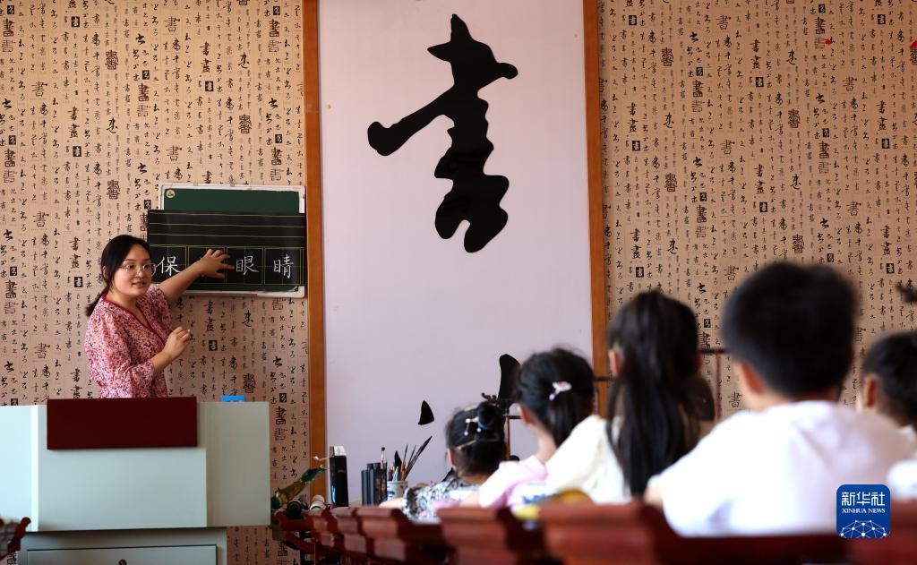 7月17日,在石家庄市建设北大街小学免费托管服务“写字课”上,老师为孩子们讲硬笔书法知识。