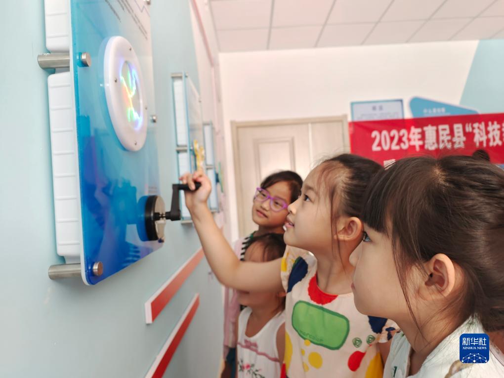 7月17日,在山东省滨州市惠民县新时代文明实践中心的科普知识屋,孩子们在体验“光电盘”。