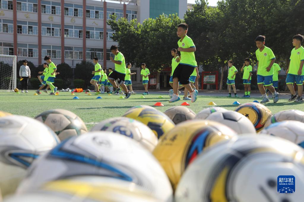 7月17日,在河南省平顶山市宝丰县山河路小学,孩子们在球场上训练。
