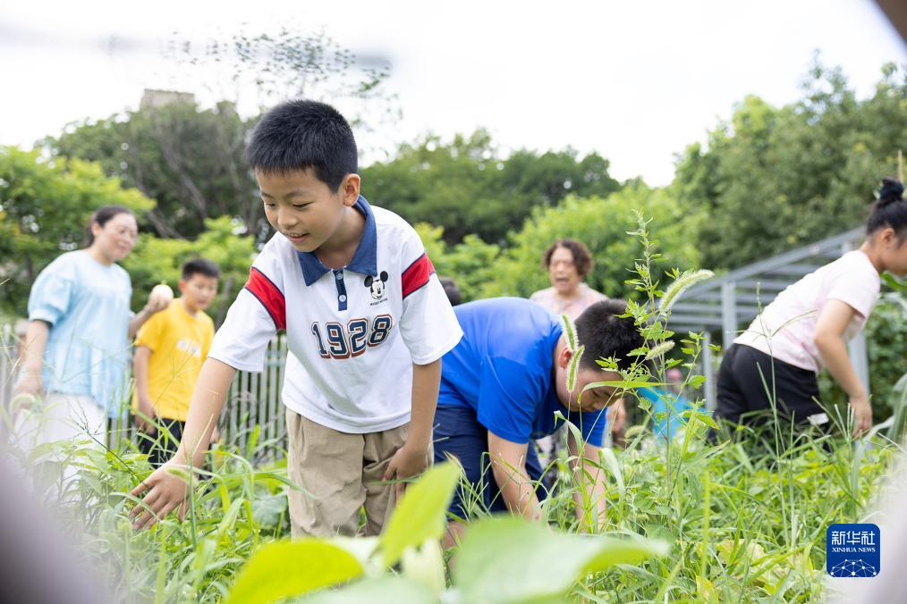 7月17日,在浙江省湖州市南太湖新区新风实验小学教育集团清河校区劳动兴趣课上,暑期托管班的学生在校农场里采摘甜瓜。