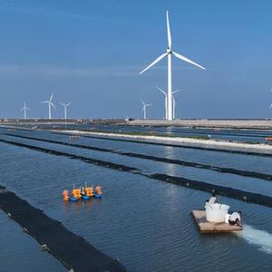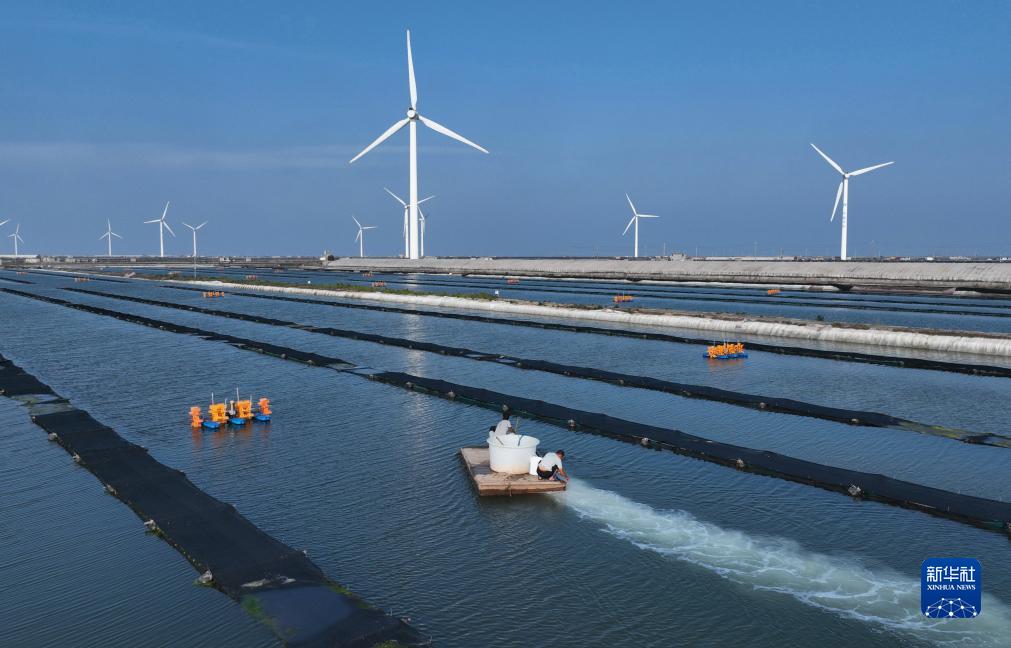 7月17日,河北省乐亭县姜各庄镇第二节村村民在海产品养殖基地管护海参(无人机照片)。