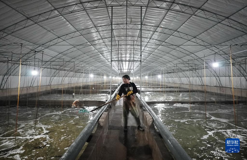 7月17日,河北省乐亭县姜各庄镇黄湾村村民在海产品工厂化养殖大棚内管护大菱鲆鱼。