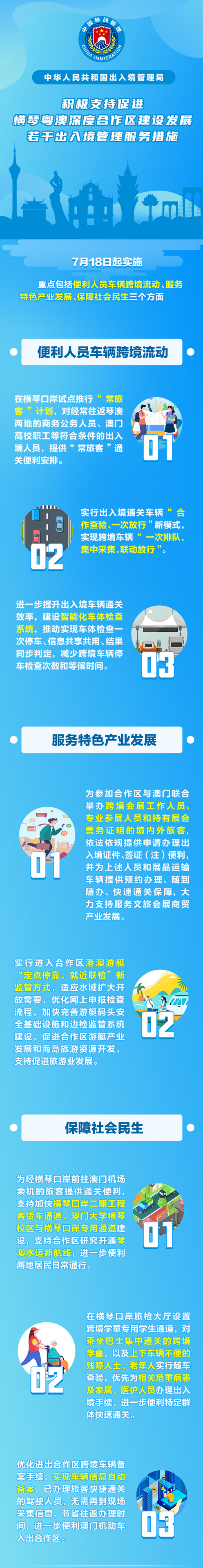 新华社北京7月18日电(记者任沁沁)中华人民共和国出入境管理局18日出台《积极支持促进横琴粤澳深度合作区建设发展若干出入境管理服务措施》,充分对接粤澳各方和广大出入境人员诉求,从便利人员车辆跨境流动、服务特色产业发展、保障社会民生三方面推动构建琴澳一体化发展格局,助力粤港澳大湾区建设。