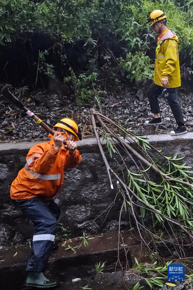 7月18日,国铁南宁局沿海铁路公司职工在清理被台风吹倒的树木。当日,国铁南宁局沿海铁路公司组织职工利用轨道车,在风雨中对西部陆海新通道铁路沿线进行巡检,对线路和防洪重点处所进行全面巡查,及时处理危竹危树、接触网设备隐患等问题,全力确保铁路运行安全。
