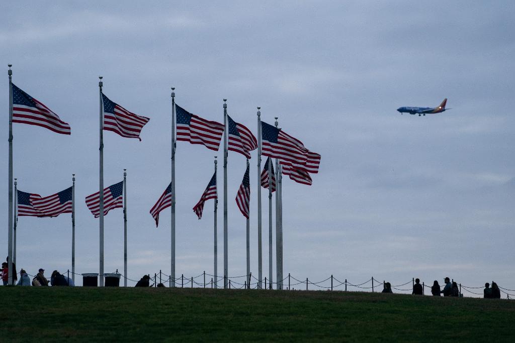 2022年11月10日,在美国首都华盛顿,一架飞机从美国国旗上空飞过。新华社记者刘杰摄