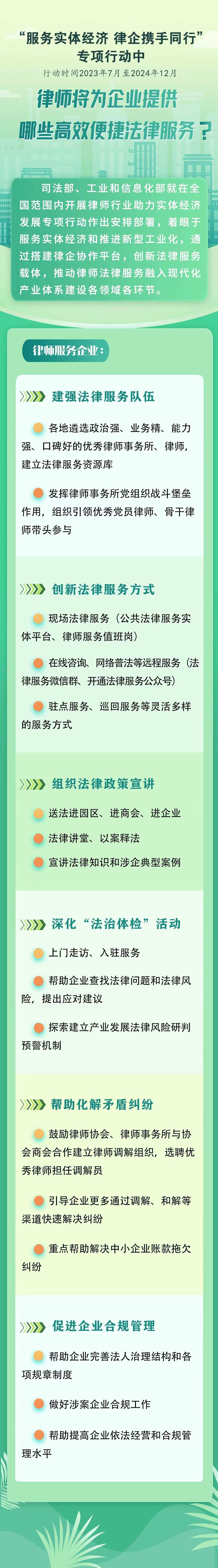 方案要求,各地司法行政部门、工业和信息化主管部门、通信管理局和律师协会要共同组织优秀律师事务所和律师,为工业和信息化领域相关企业提供全业务、全时空、高效便捷的法律服务。活动中,要摸清各类企业法律服务需求,建强法律服务队伍,创新法律服务方式,通过开展法律政策宣讲、深化“法治体检”活动等形式,推动律师行业服务实体经济的广度和深度不断拓展,服务的专业性、精准性、便捷性、实效性不断增强,帮助企业化解法律风险,解决法律问题,维护合法权益,提升依法合规经营管理水平。