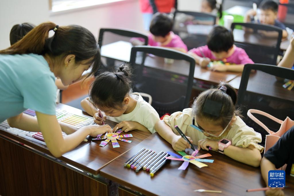 7月19日,孩子们在河北省唐山市丰南区新华社区开办的“爱心暑托班”上学习手工制作。