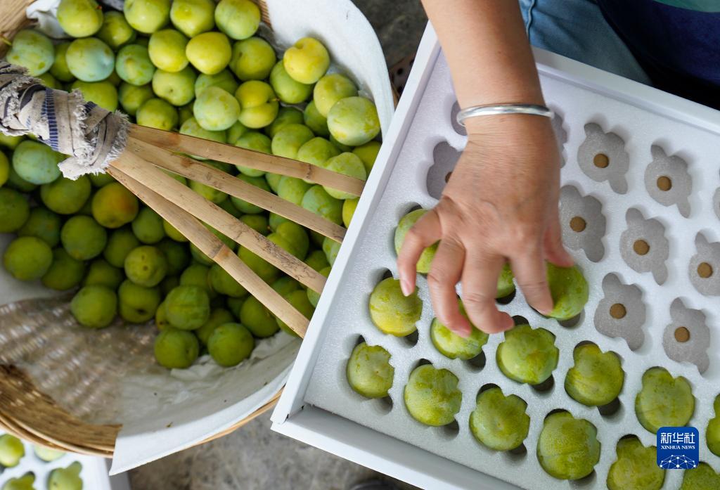 6月29日,在重庆市巫山县巫峡镇文峰村的巫山脆李种植园内,种植户将新鲜的巫山脆李装箱准备发往外地。