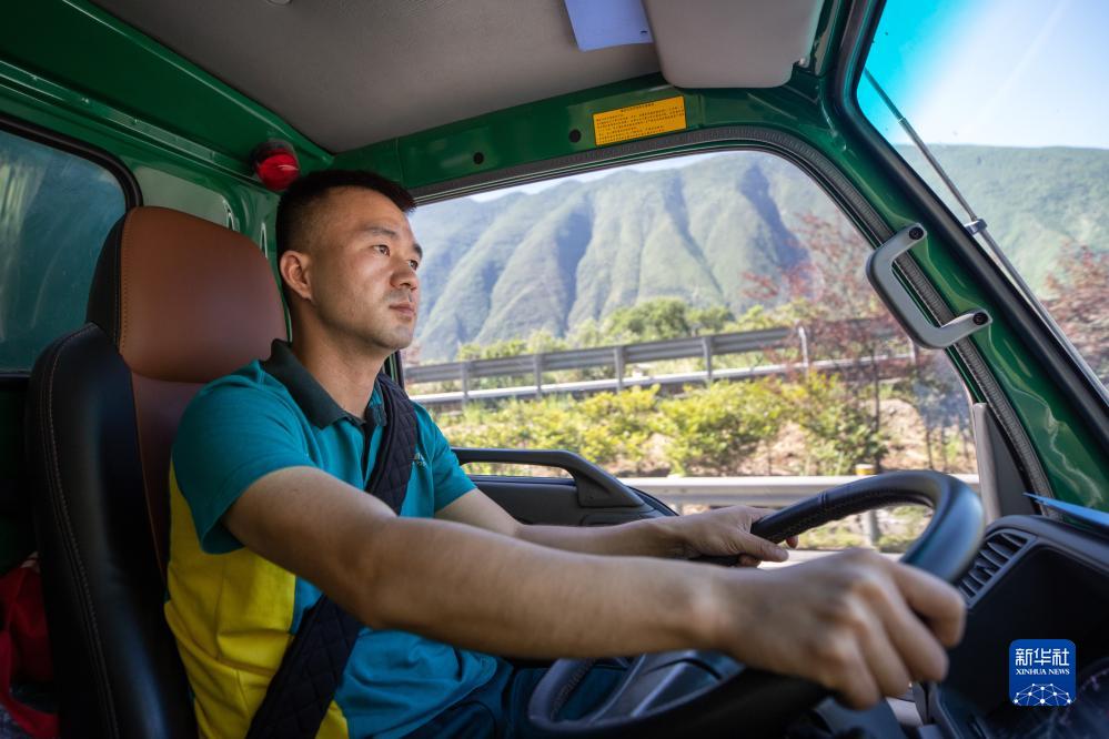 6月30日,在重庆市巫山县,中国邮政重庆巫山县分公司的工作人员驾驶载着巫山脆李的物流车行驶在高速公路上。