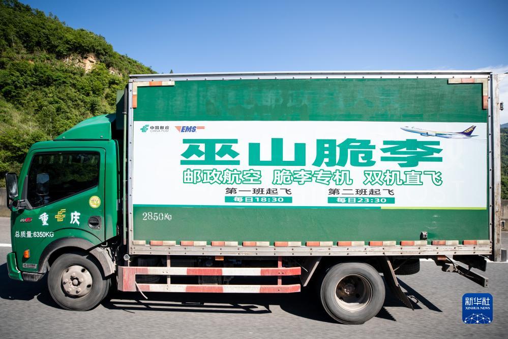 6月30日,在重庆市巫山县,载着巫山脆李的中国邮政物流车行驶在高速公路上。