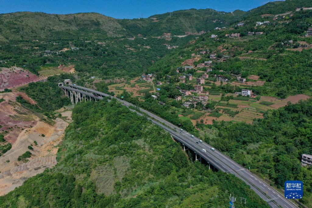 6月30日,在重庆市巫山县境内,载着巫山脆李的中国邮政物流车在高速公路上行驶(无人机照片)。