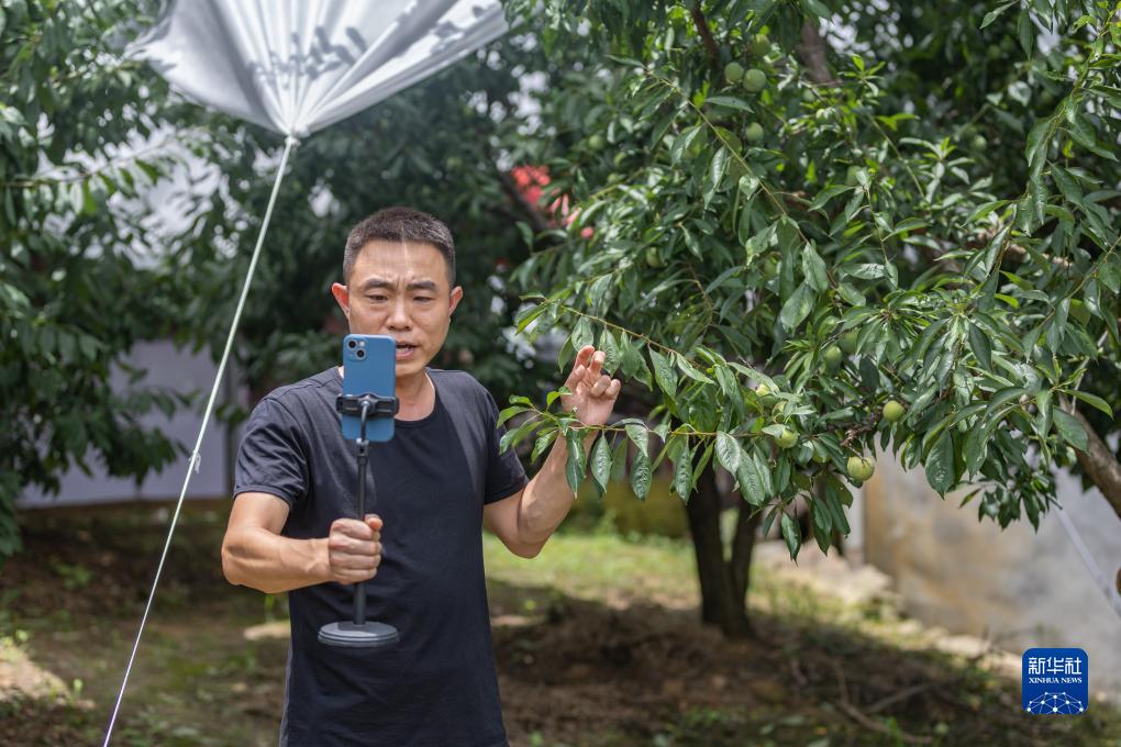 6月30日,在重庆市巫山县曲尺乡柑园村,一名主播通过网络直播售卖巫山脆李。