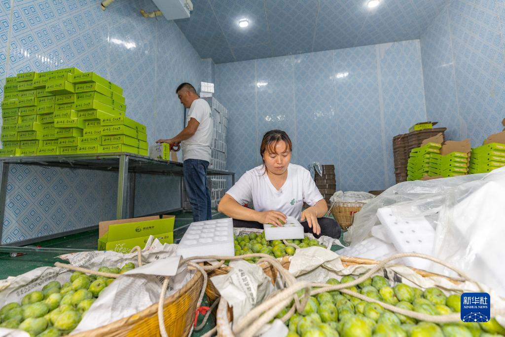 6月28日,在重庆市巫山县曲尺乡柑园村的脆李分拣中心,邮政工作人员在打包巫山脆李。