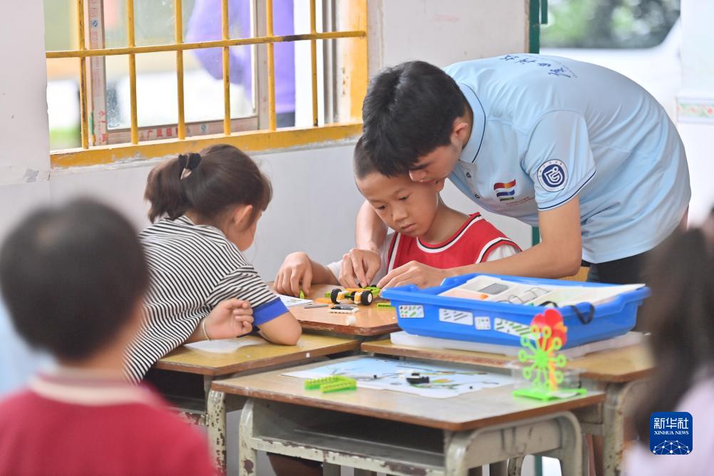 7月18日,在柳州市融安县泗顶镇中心小学,大学生在指导小学生组装机器人。
