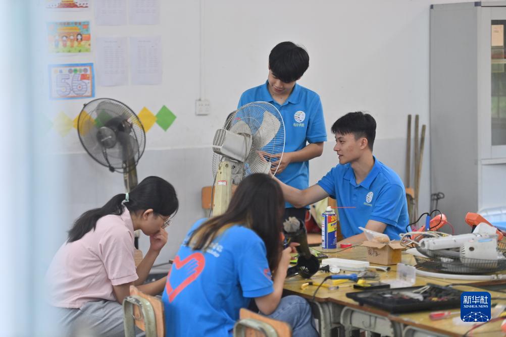 7月18日,在柳州市融安县泗顶镇中心小学,大学生给附近村民维修家电。
