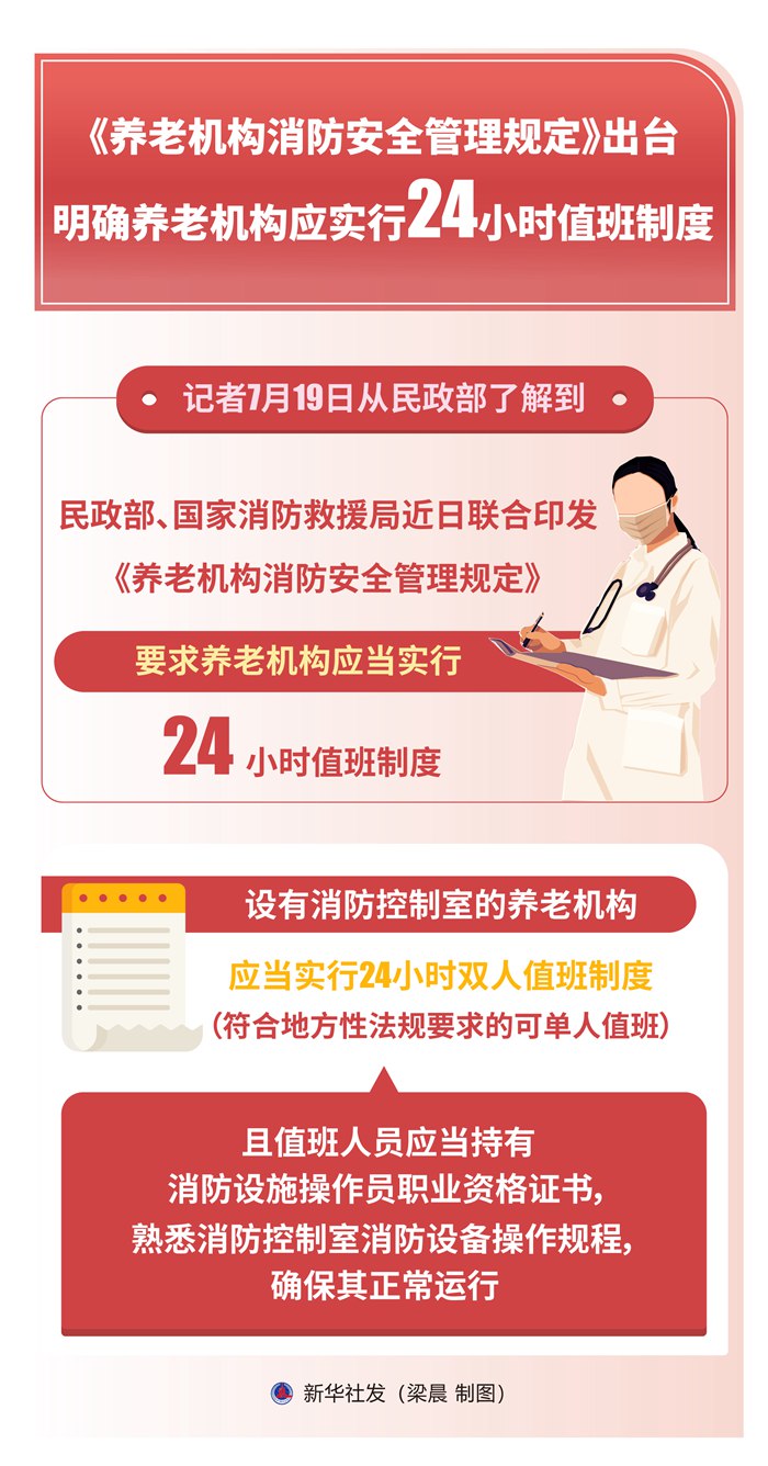 新华社北京7月19日电(记者高蕾)记者19日从民政部了解到,民政部、国家消防救援局近日联合印发《养老机构消防安全管理规定》,要求养老机构应当实行24小时值班制度。设有消防控制室的养老机构,应当实行24小时双人值班制度(符合地方性法规要求的可单人值班),且值班人员应当持有消防设施操作员职业资格证书,熟悉消防控制室消防设备操作规程,确保其正常运行。