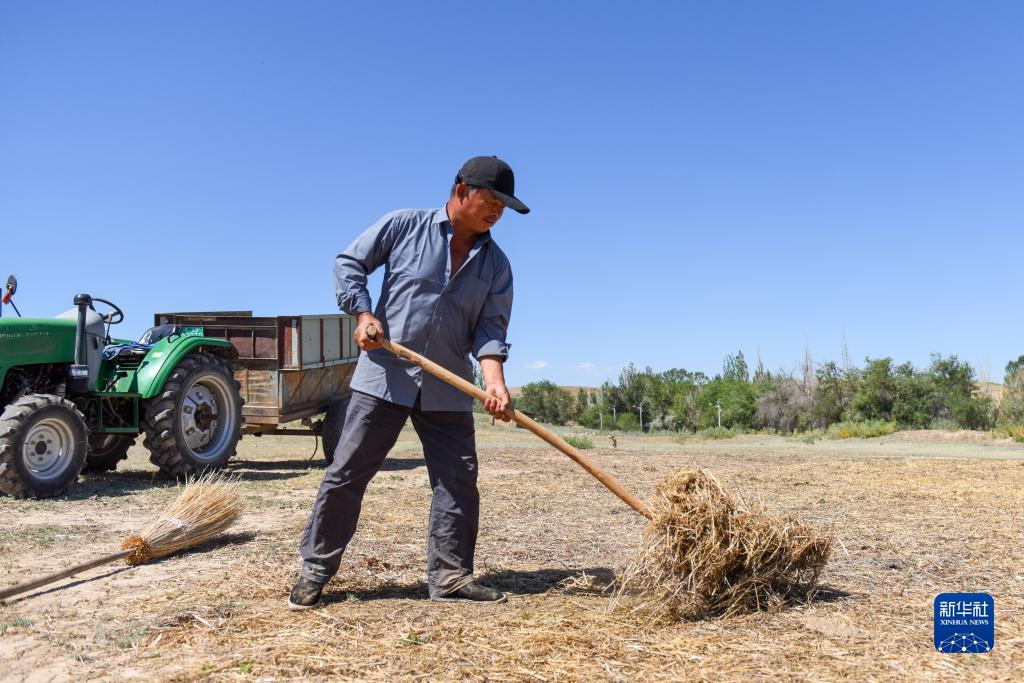 在新疆昌吉回族自治州木垒哈萨克自治县照壁山乡北闸村,粮农陈文兵在清理晒场(7月14日摄)。新华社记者 丁磊 摄
