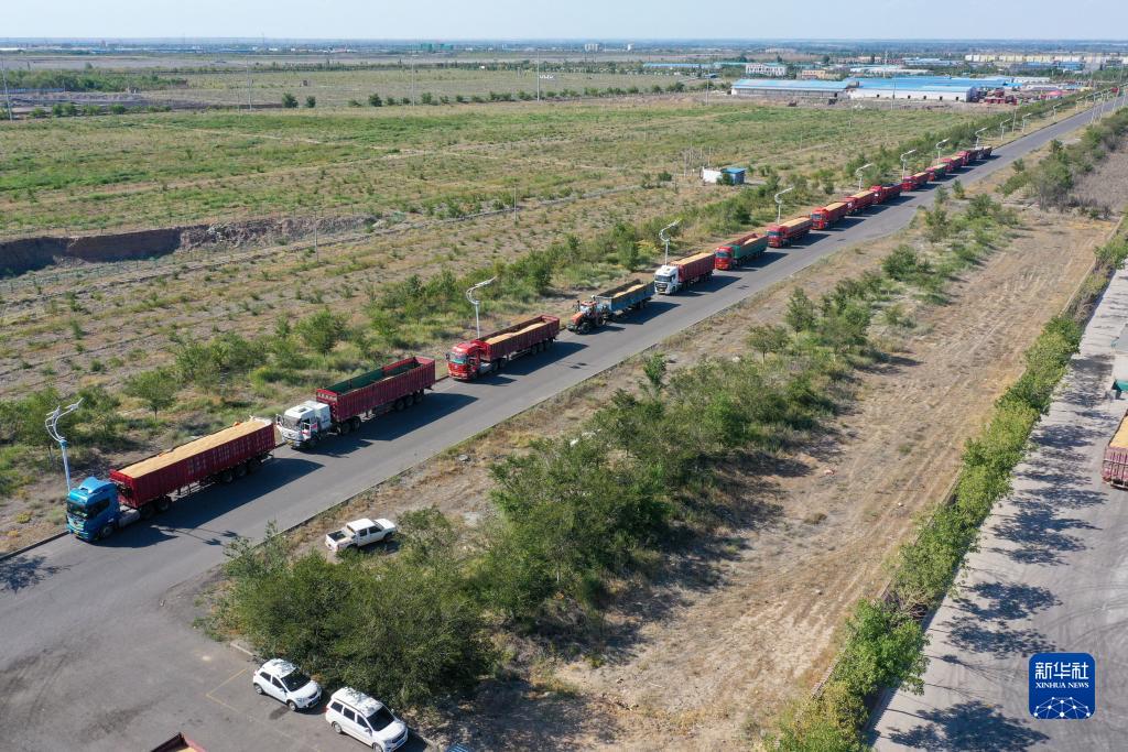 在新疆昌粮集团呼图壁粮油有限责任公司仓库门前,运粮车排队等待卸粮(7月15日摄,无人机照片)。新华社记者 丁磊 摄