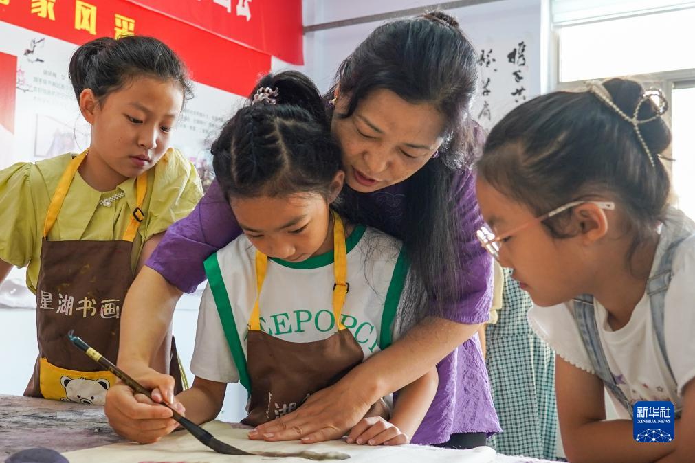 7月19日,在无棣县棣丰街道星湖社区服务中心,志愿者教孩子们绘画。