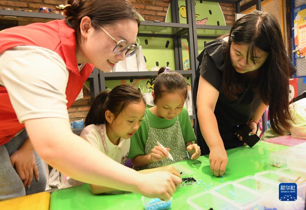 7月19日,青少年在小西街手作生活街体验“拼豆”制作。