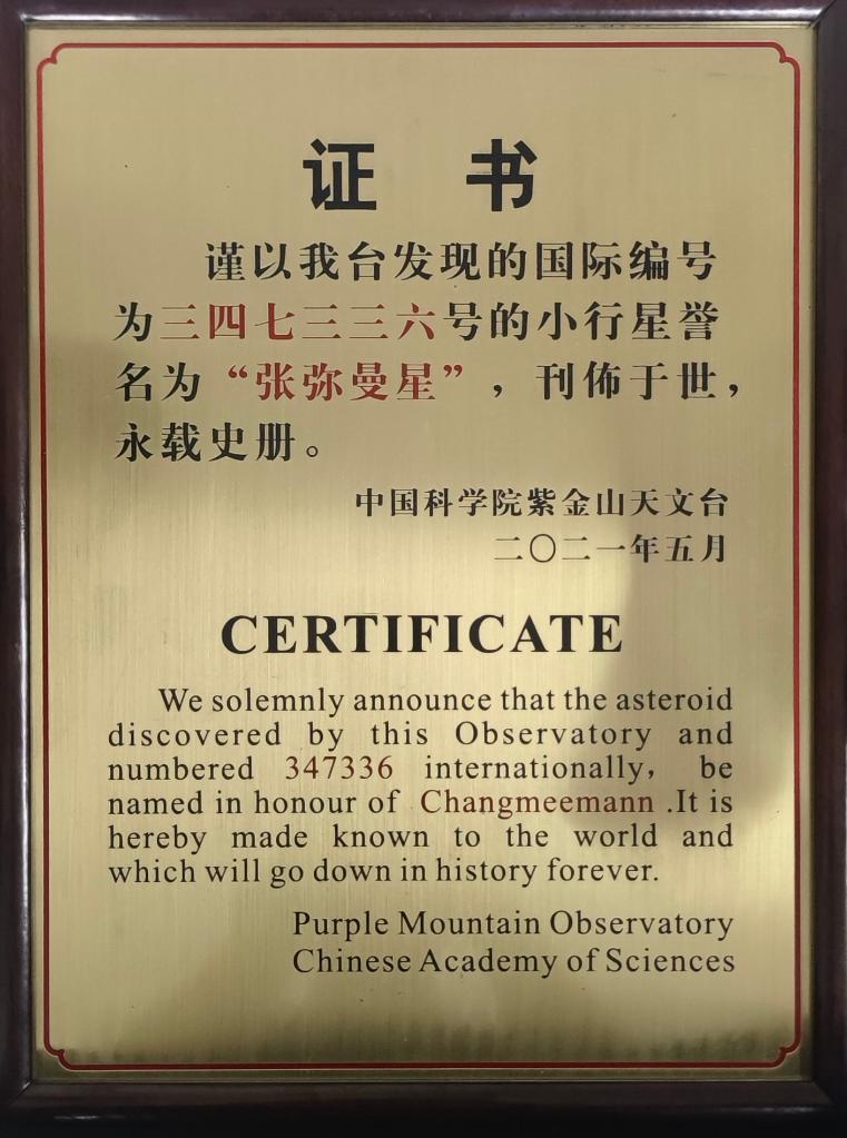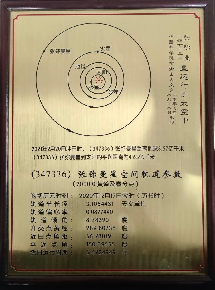 新华社昆明7月19日电(记者 张旻曦)7月19日,“张弥曼星”命名仪式在云南曲靖举行。经国际小行星命名委员会批准,由中国科学院紫金山天文台发现、国际编号为347336号的小行星被正式命名为“张弥曼星”。