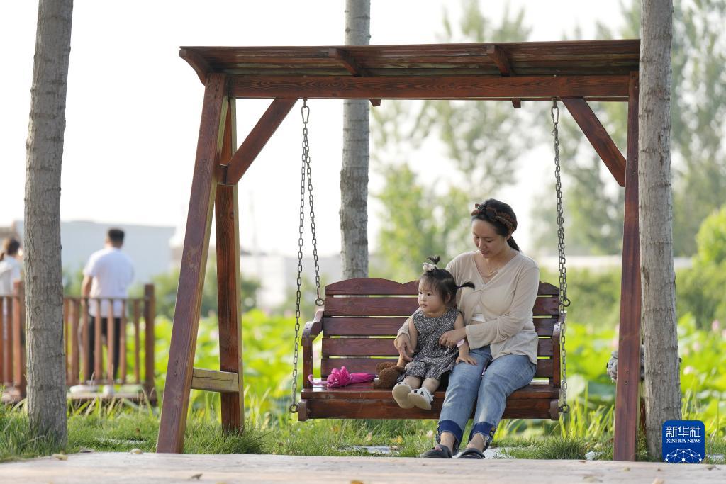 7月19日,村民在河北省唐山市丰南区北孙庄村一处水上游园内休闲。
