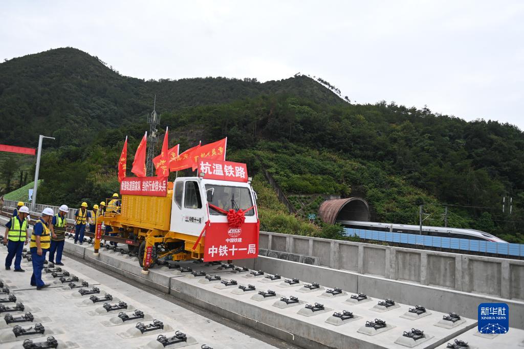 新华社北京7月20日电(记者 樊曦)记者从中国铁建股份有限公司了解到,20日,在杭温高铁香山岭隧道出口施工现场,随着中铁十一局建设者将首对500米长钢轨平稳铺设在无砟轨道板上,杭温高铁开始全线铺轨。