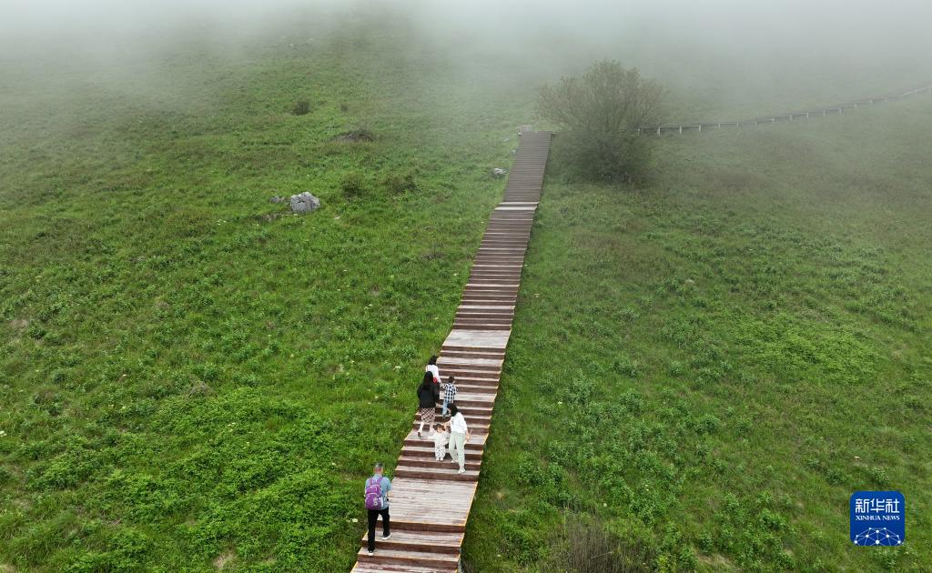 7月19日,游客沿着木栈道在陕西省汉中市留坝县紫柏山景区游玩(无人机照片)。