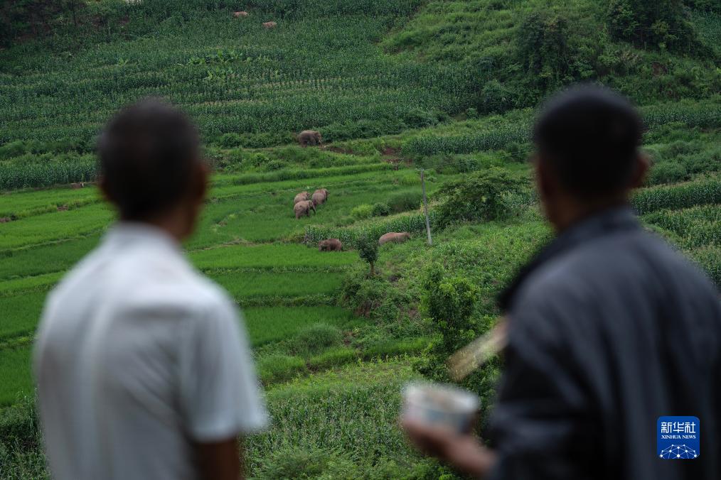 7月19日,两名村民一边吃饭一边遥望远处的象群。
