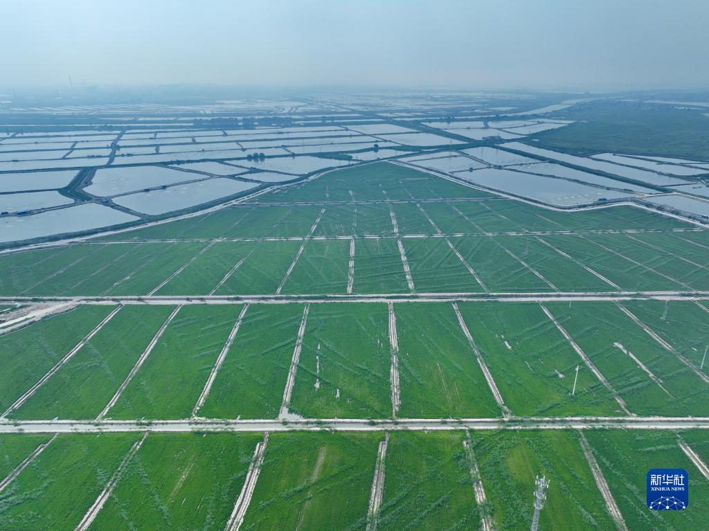河北省唐山市丰南区黑沿子镇由盐碱地改良而成的水稻田(7月20日摄,无人机照片)。