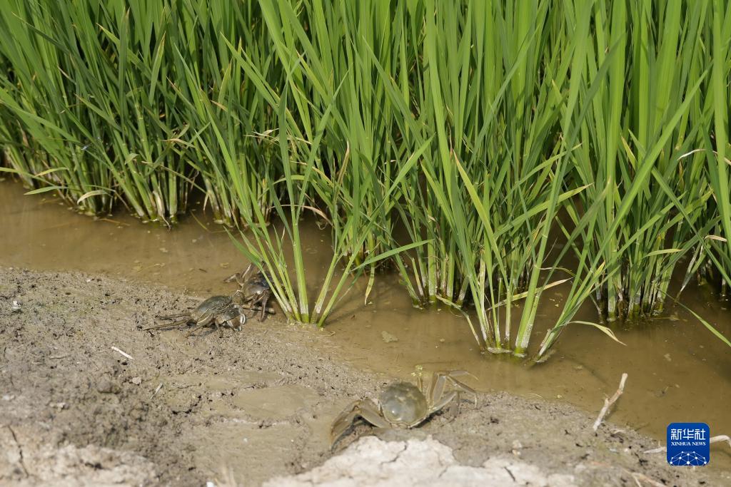 河北省唐山市丰南区黑沿子镇一处由盐碱地改良而成的稻渔综合种养试点区内的稻田蟹(7月20日摄)。