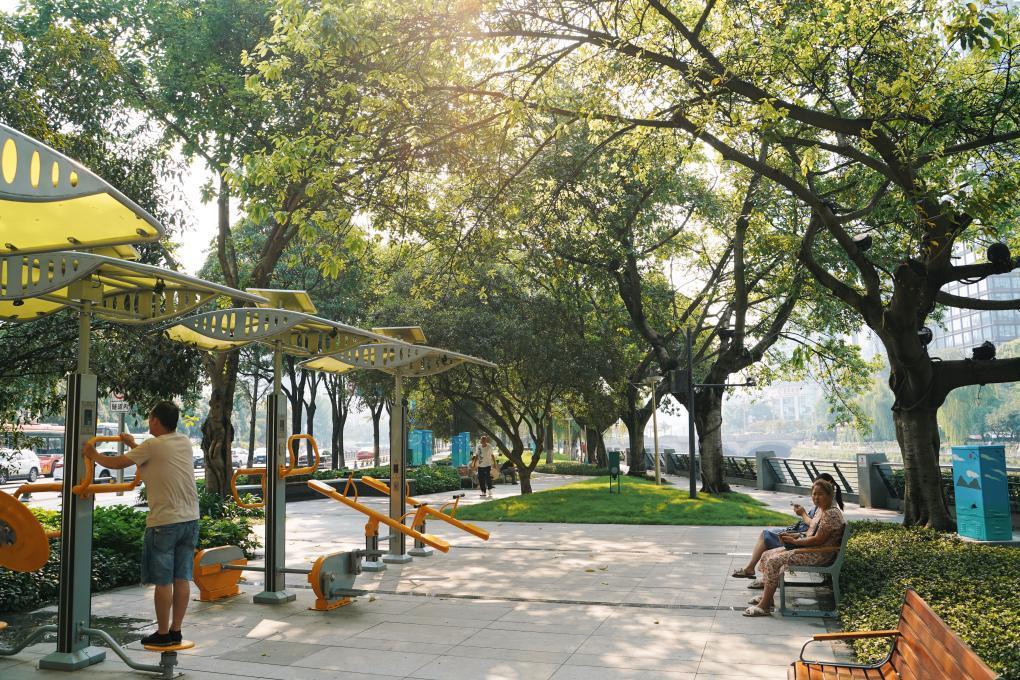 锦江水得到治理,沿岸的公共空间也越来越美了。截至目前,都江堰—黄龙溪220公里锦江绿道全线贯通,沿线串联起江滩公园、活水公园等8个特色主题公园。如今,逛公园已经成为成都人的一种生活方式,江畔边、公园里总少不了市民运动休闲的身影。