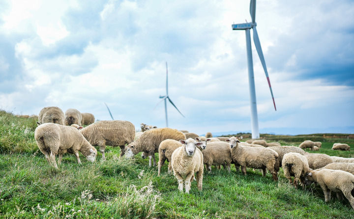 毕节威宁县雪山镇村民饲养的羊群在风力发电设备下的草场吃草(7月13日摄)。新华社记者 陶亮 摄