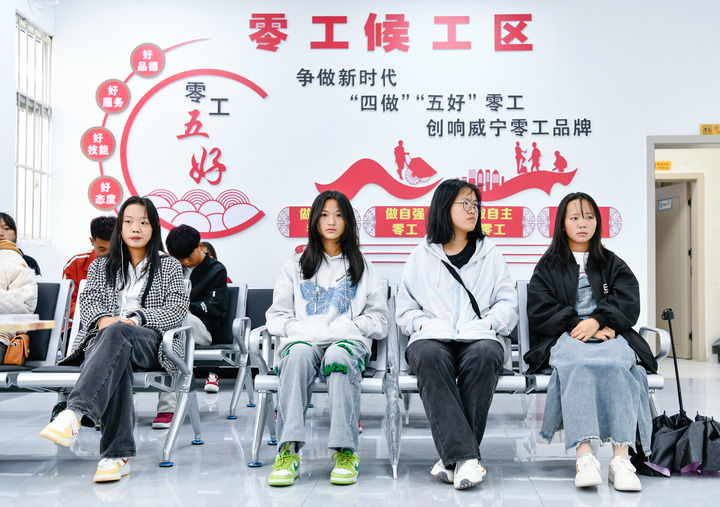 职业学校的学生在贵州省威宁县人力资源服务产业园等待招聘会开始(7月19日摄)。新华社记者 杨文斌 摄