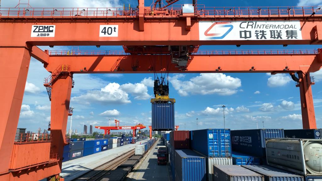 图为正在进行装卸作业的中欧班列。(丁旭 摄)