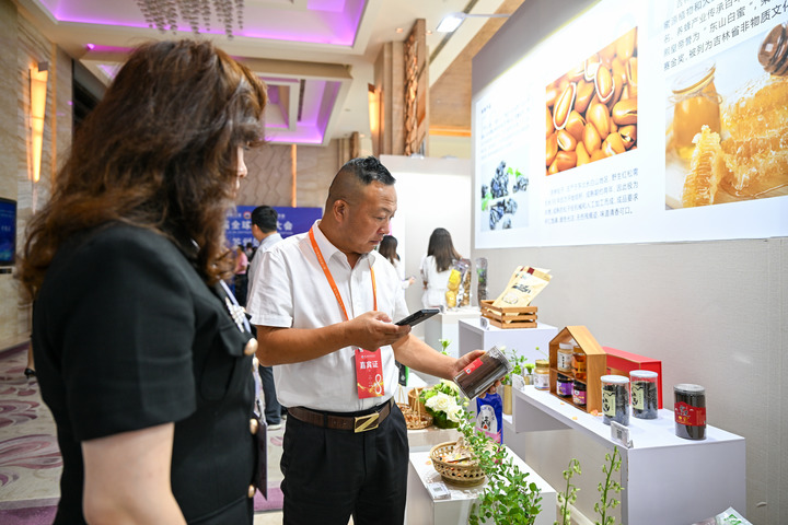 7月20日,参会嘉宾在第八届全球吉商大会上参观吉林特色商品。新华社记者 颜麟蕴 摄