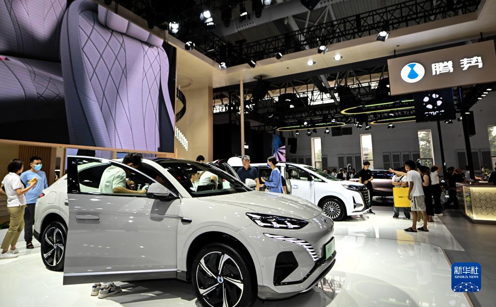 观众在长春汽博会的腾势汽车展位上咨询体验新能源汽车(7月17日摄)。