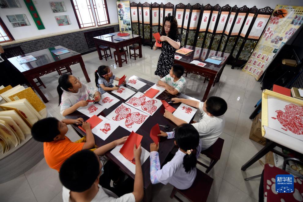 7月21日,在河北省丰宁县暑假“非遗小课堂”,丰宁县第一小学教师任洪茹为学生讲解剪纸技艺。
