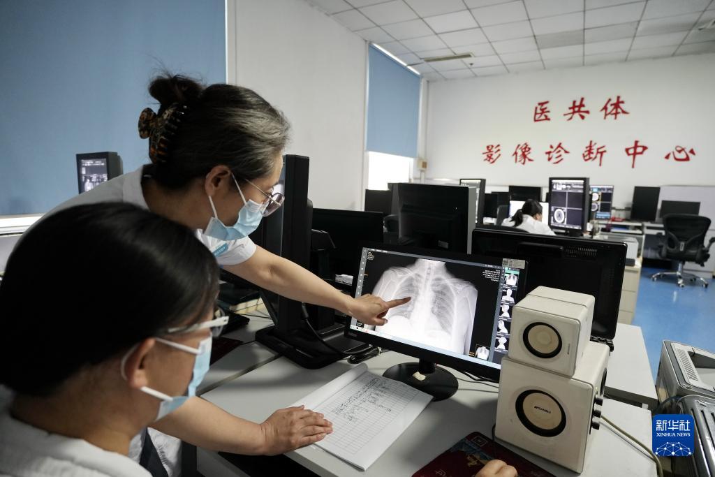 7月21日,河北省滦州市人民医院的医生在医共体影像诊疗中心分析乡镇医院上传的患者影像图片。