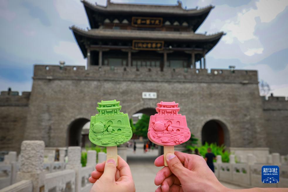 7月20日在山东省枣庄市台儿庄古城拍摄的台儿庄古城墙造型文创雪糕。