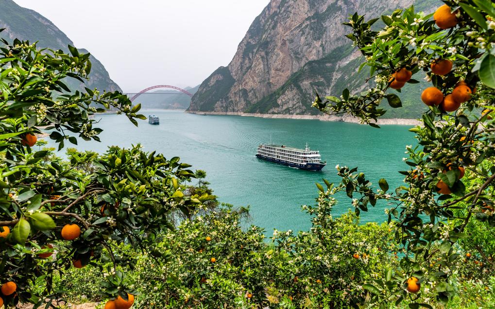 ↑2022年3月17日,船舶从三峡库区秭归县链子岩村脐橙果园前开过。
