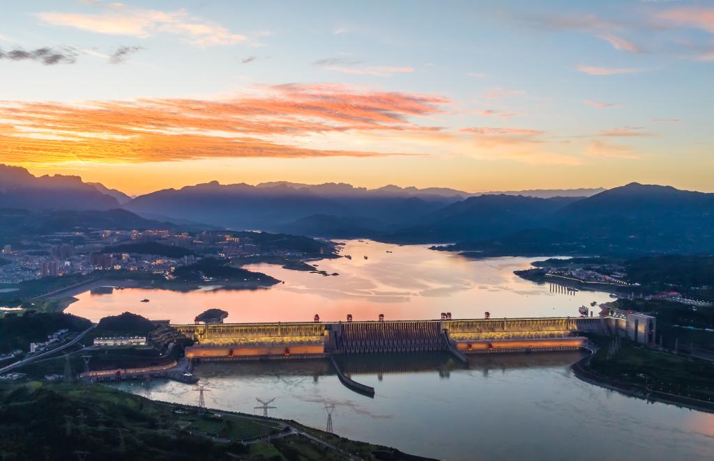 ↑这是7月9日在湖北省宜昌市拍摄的夕阳映照下的三峡水利枢纽工程(无人机照片)。