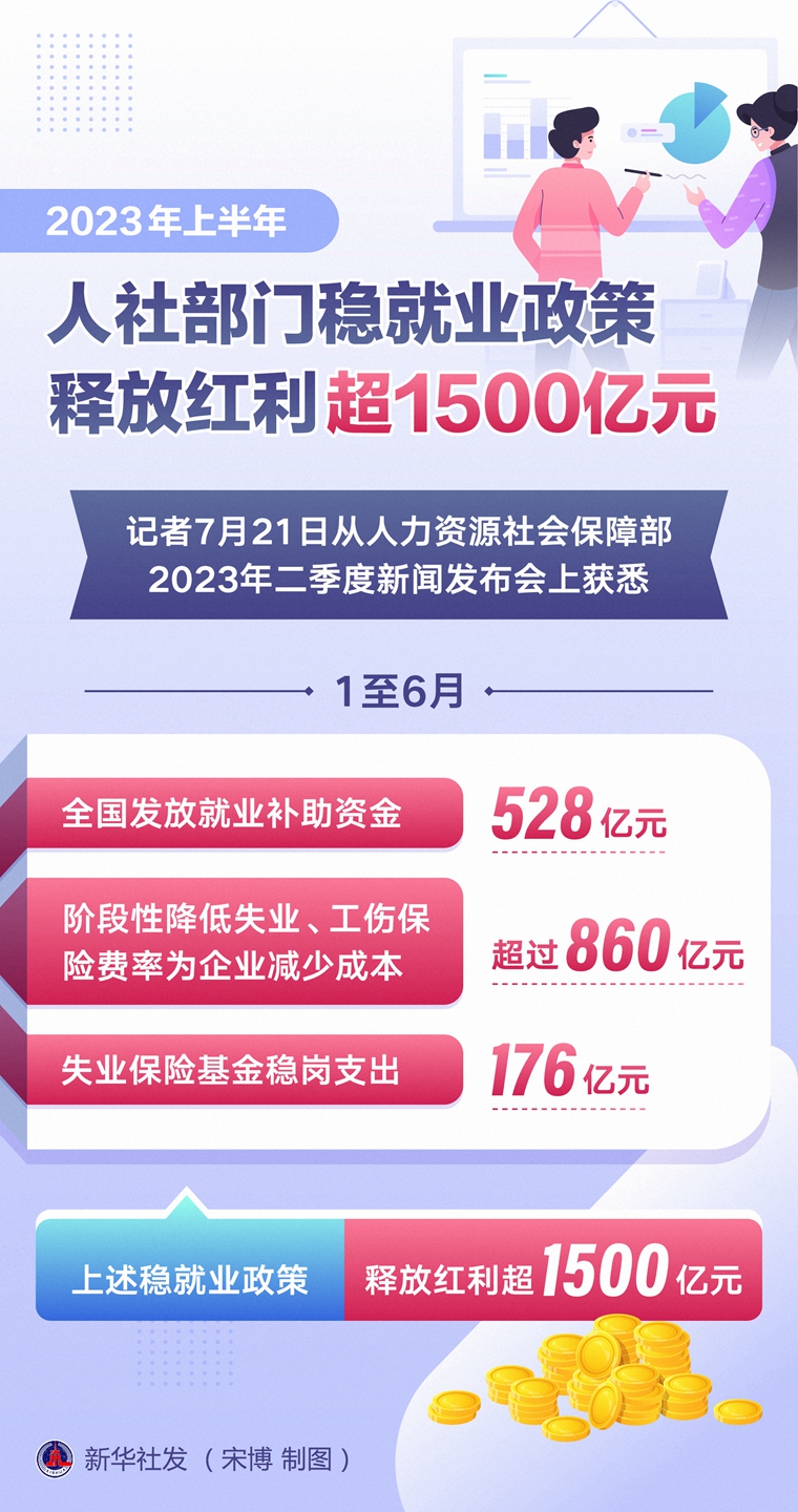 新华社北京7月21日电(记者黄垚、姜琳)记者21日从人力资源社会保障部2023年二季度新闻发布会上获悉,1至6月,全国发放就业补助资金528亿元,阶段性降低失业、工伤保险费率为企业减少成本超过860亿元,失业保险基金稳岗支出176亿元。上述稳就业政策释放红利超1500亿元。
