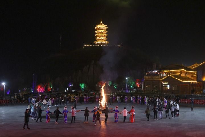 贵州省晴隆县阿妹戚托小镇易地扶贫搬迁群众和游客在金门广场围绕篝火跳舞(3月29日摄)。新华社记者 崔晓强 摄