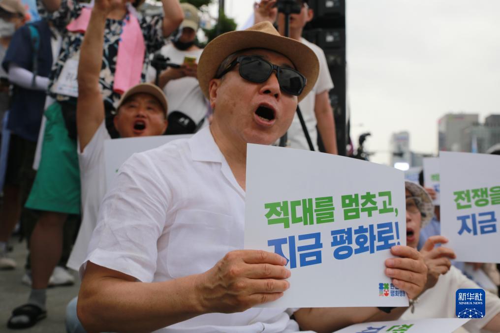 7月22日,在韩国首尔,人们手举标语参与反战游行。新华社发(杨畅 摄)